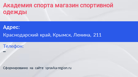 Академия спорта, магазин спортивной одежды по адресу Краснодарский край, Крымск, Ленина, 211 в дальнейшем Организация, размещена в следующих категориях:
