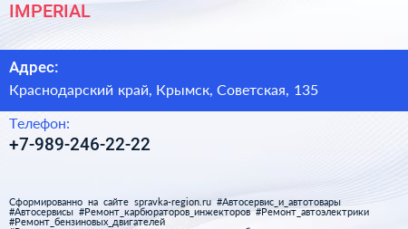 IMPERIAL по адресу Краснодарский край, Крымск, Советская, 135 в дальнейшем Организация, размещена в следующих категориях: