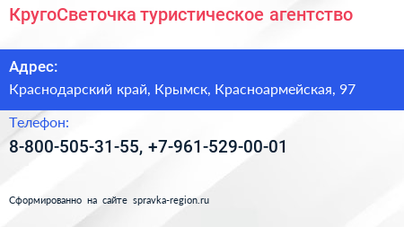 КругоСветочка, туристическое агентство по адресу Краснодарский край, Крымск, Красноармейская, 97 в дальнейшем Организация, размещена в следующих категориях: