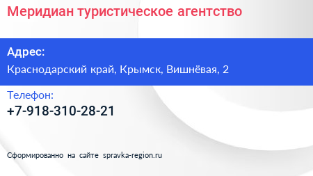 Меридиан, туристическое агентство по адресу Краснодарский край, Крымск, Вишнёвая, 2 в дальнейшем Организация, размещена в следующих категориях: