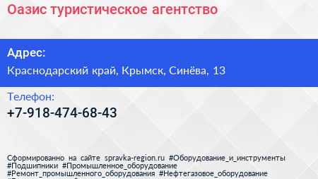 Оазис, туристическое агентство по адресу Краснодарский край, Крымск, Синёва, 13 в дальнейшем Организация, размещена в следующих категориях: