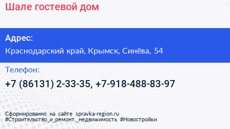 Шале, гостевой дом по адресу Краснодарский край, Крымск, Синёва, 54 в дальнейшем Организация, размещена в следующих категориях: