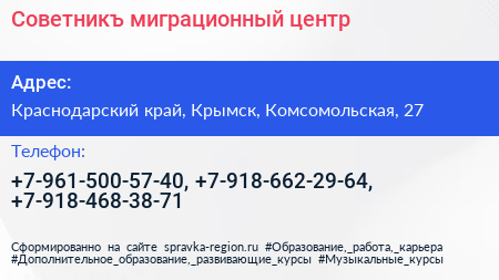 Советникъ, миграционный центр по адресу Краснодарский край, Крымск, Комсомольская, 27 в дальнейшем Организация, размещена в следующих категориях: