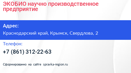 ЭКОБИО, научно-производственное предприятие по адресу Краснодарский край, Крымск, Свердлова, 2 в дальнейшем Организация, размещена в следующих категориях: