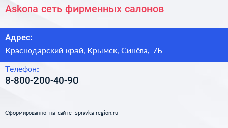 Askona, сеть фирменных салонов по адресу Краснодарский край, Крымск, Синёва, 7Б в дальнейшем Организация, размещена в следующих категориях: