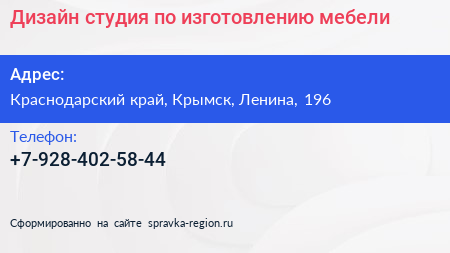 Дизайн-студия по изготовлению мебели по адресу Краснодарский край, Крымск, Ленина, 196 в дальнейшем Организация, размещена в следующих категориях: