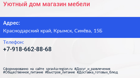 Уютный дом, магазин мебели по адресу Краснодарский край, Крымск, Синёва, 15Б в дальнейшем Организация, размещена в следующих категориях: