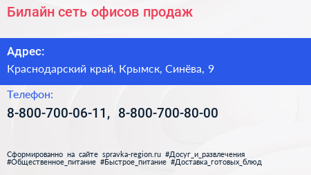 Билайн, сеть офисов продаж по адресу Краснодарский край, Крымск, Синёва, 9 в дальнейшем Организация, размещена в следующих категориях: