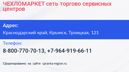 ЧЕХЛОМАРКЕТ, сеть торгово-сервисных центров по адресу Краснодарский край, Крымск, Троицкая, 121 в дальнейшем Организация, размещена в следующих категориях: