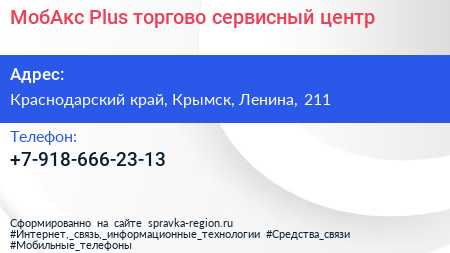 МобАкс Plus, торгово-сервисный центр по адресу Краснодарский край, Крымск, Ленина, 211 в дальнейшем Организация, размещена в следующих категориях: