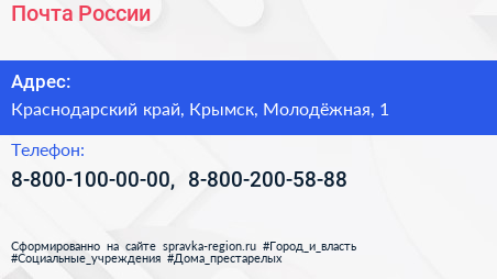 Почта России по адресу Краснодарский край, Крымск, Молодёжная, 1 в дальнейшем Организация, размещена в следующих категориях: