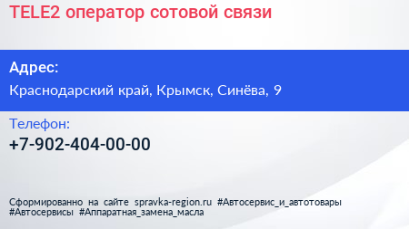 TELE2, оператор сотовой связи по адресу Краснодарский край, Крымск, Синёва, 9 в дальнейшем Организация, размещена в следующих категориях:
