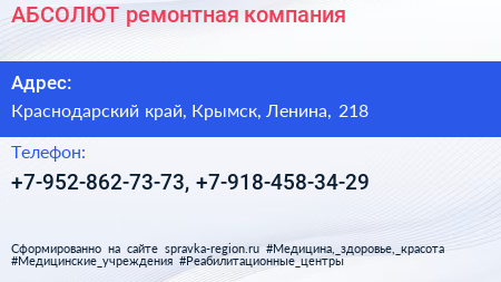 АБСОЛЮТ, ремонтная компания по адресу Краснодарский край, Крымск, Ленина, 218 в дальнейшем Организация, размещена в следующих категориях:
