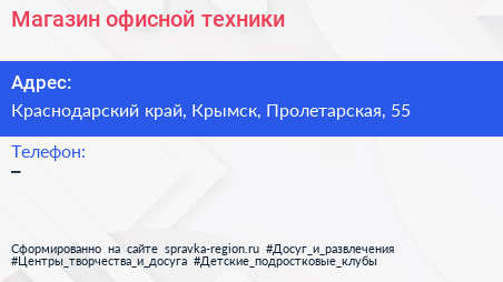 Магазин офисной техники по адресу Краснодарский край, Крымск, Пролетарская, 55 в дальнейшем Организация, размещена в следующих категориях: