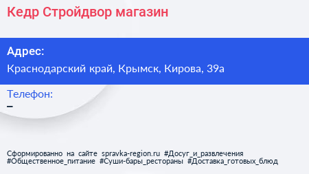 Кедр Стройдвор, магазин по адресу Краснодарский край, Крымск, Кирова, 39а в дальнейшем Организация, размещена в следующих категориях: