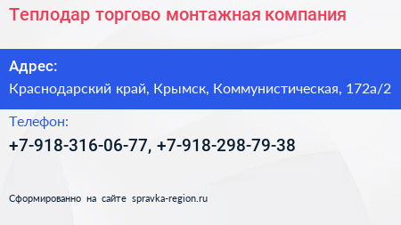 Теплодар, торгово-монтажная компания по адресу Краснодарский край, Крымск, Коммунистическая, 172а/2 в дальнейшем Организация, размещена в следующих категориях: