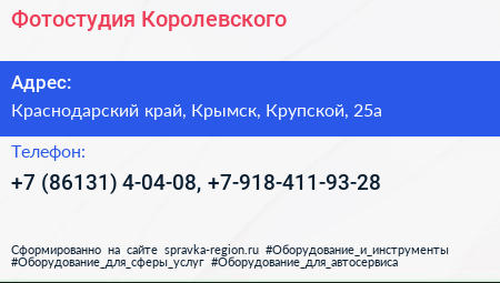 Фотостудия Королевского по адресу Краснодарский край, Крымск, Крупской, 25а в дальнейшем Организация, размещена в следующих категориях: