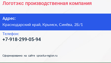 Логотэкс, производственная компания по адресу Краснодарский край, Крымск, Синёва, 2Б/1 в дальнейшем Организация, размещена в следующих категориях: