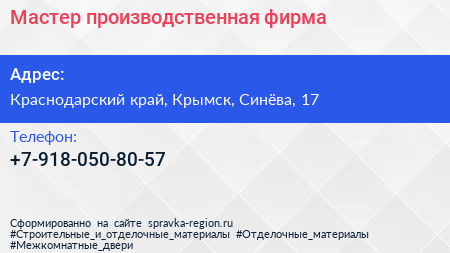 Мастер, производственная фирма по адресу Краснодарский край, Крымск, Синёва, 17 в дальнейшем Организация, размещена в следующих категориях: