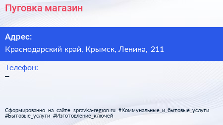 Пуговка, магазин по адресу Краснодарский край, Крымск, Ленина, 211 в дальнейшем Организация, размещена в следующих категориях: