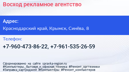 Восход, рекламное агентство по адресу Краснодарский край, Крымск, Синёва, 8 в дальнейшем Организация, размещена в следующих категориях: