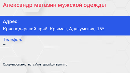 Александр, магазин мужской одежды по адресу Краснодарский край, Крымск, Адагумская, 155 в дальнейшем Организация, размещена в следующих категориях: