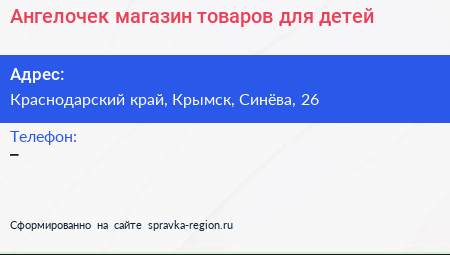 Ангелочек, магазин товаров для детей по адресу Краснодарский край, Крымск, Синёва, 26 в дальнейшем Организация, размещена в следующих категориях: