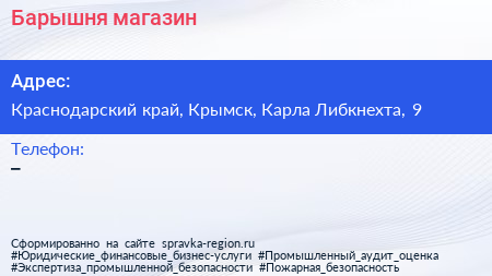 Барышня, магазин по адресу Краснодарский край, Крымск, Карла Либкнехта, 9 в дальнейшем Организация, размещена в следующих категориях:
