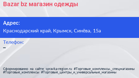 Bazar.bz, магазин одежды по адресу Краснодарский край, Крымск, Синёва, 15а в дальнейшем Организация, размещена в следующих категориях: