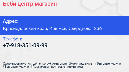 Беби-центр, магазин по адресу Краснодарский край, Крымск, Свердлова, 236 в дальнейшем Организация, размещена в следующих категориях: