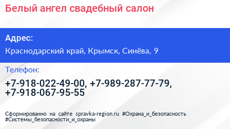 Белый ангел, свадебный салон по адресу Краснодарский край, Крымск, Синёва, 9 в дальнейшем Организация, размещена в следующих категориях: