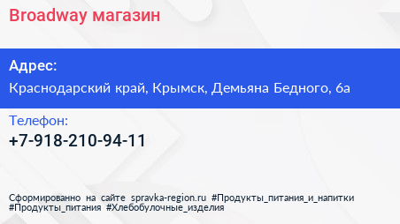 Broadway, магазин по адресу Краснодарский край, Крымск, Демьяна Бедного, 6а в дальнейшем Организация, размещена в следующих категориях:
