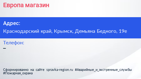 Европа, магазин по адресу Краснодарский край, Крымск, Демьяна Бедного, 19е в дальнейшем Организация, размещена в следующих категориях: