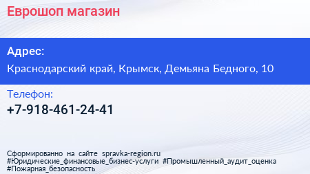 Еврошоп, магазин по адресу Краснодарский край, Крымск, Демьяна Бедного, 10 в дальнейшем Организация, размещена в следующих категориях: