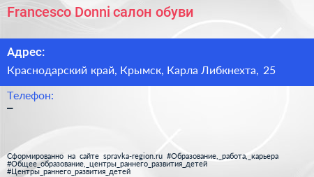 Francesco Donni, салон обуви по адресу Краснодарский край, Крымск, Карла Либкнехта, 25 в дальнейшем Организация, размещена в следующих категориях: