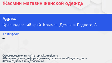 Жасмин, магазин женской одежды по адресу Краснодарский край, Крымск, Демьяна Бедного, 8 в дальнейшем Организация, размещена в следующих категориях: