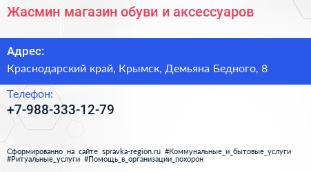 Жасмин, магазин обуви и аксессуаров по адресу Краснодарский край, Крымск, Демьяна Бедного, 8 в дальнейшем Организация, размещена в следующих категориях: