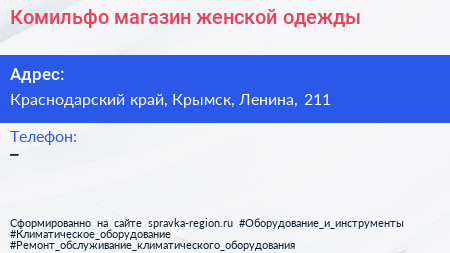 Комильфо, магазин женской одежды по адресу Краснодарский край, Крымск, Ленина, 211 в дальнейшем Организация, размещена в следующих категориях: