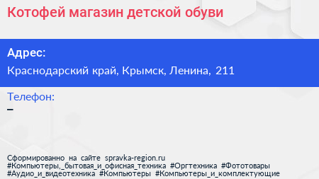 Котофей, магазин детской обуви по адресу Краснодарский край, Крымск, Ленина, 211 в дальнейшем Организация, размещена в следующих категориях: