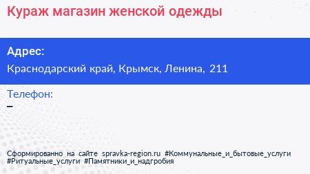 Кураж, магазин женской одежды по адресу Краснодарский край, Крымск, Ленина, 211 в дальнейшем Организация, размещена в следующих категориях: