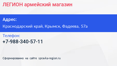 ЛЕГИОН, армейский магазин по адресу Краснодарский край, Крымск, Фадеева, 57а в дальнейшем Организация, размещена в следующих категориях: