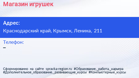 Магазин игрушек по адресу Краснодарский край, Крымск, Ленина, 211 в дальнейшем Организация, размещена в следующих категориях: