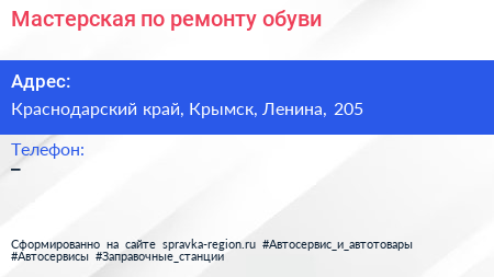 Мастерская по ремонту обуви по адресу Краснодарский край, Крымск, Ленина, 205 в дальнейшем Организация, размещена в следующих категориях: