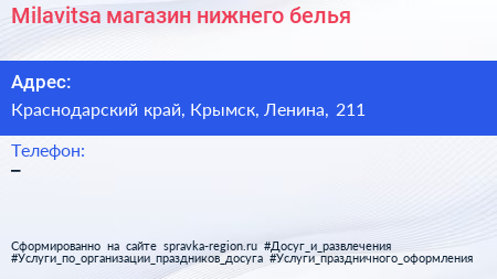 Milavitsa, магазин нижнего белья по адресу Краснодарский край, Крымск, Ленина, 211 в дальнейшем Организация, размещена в следующих категориях:
