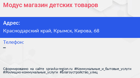 Модус, магазин детских товаров по адресу Краснодарский край, Крымск, Кирова, 68 в дальнейшем Организация, размещена в следующих категориях: