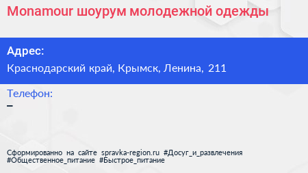 Monamour, шоурум молодежной одежды по адресу Краснодарский край, Крымск, Ленина, 211 в дальнейшем Организация, размещена в следующих категориях: