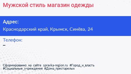 Мужской стиль, магазин одежды по адресу Краснодарский край, Крымск, Синёва, 24 в дальнейшем Организация, размещена в следующих категориях: