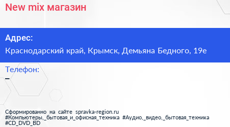 New mix, магазин по адресу Краснодарский край, Крымск, Демьяна Бедного, 19е в дальнейшем Организация, размещена в следующих категориях: