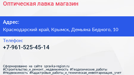 Оптическая лавка, магазин по адресу Краснодарский край, Крымск, Демьяна Бедного, 10 в дальнейшем Организация, размещена в следующих категориях: