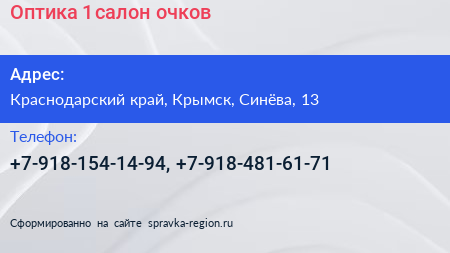 Оптика №1, салон очков по адресу Краснодарский край, Крымск, Синёва, 13 в дальнейшем Организация, размещена в следующих категориях: